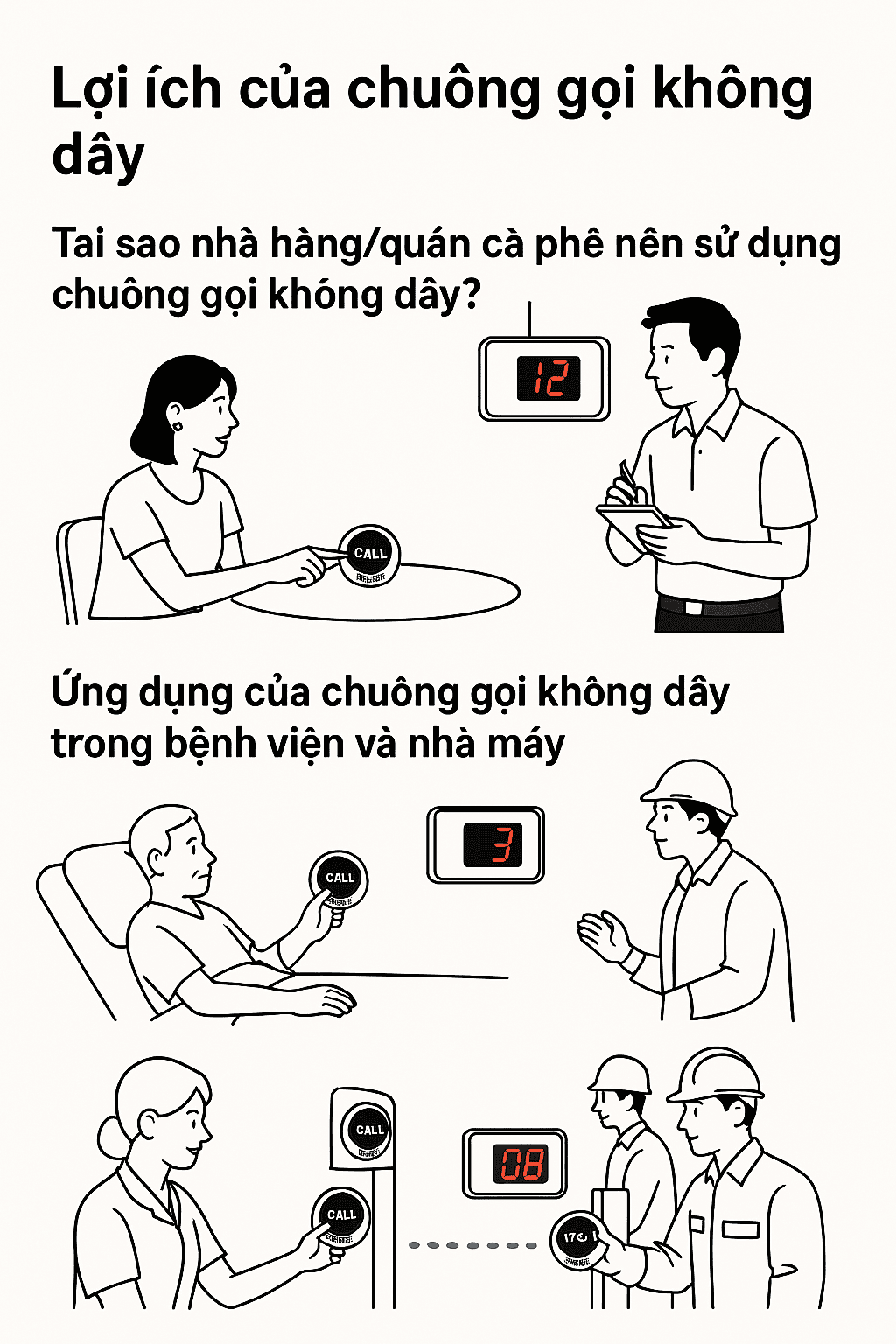 Chuông gọi không dây không chỉ hữu ích trong lĩnh vực F&B mà còn đóng vai trò quan trọng trong bệnh viện và nhà máy, giúp cải thiện hiệu quả làm việc và đảm bảo an toàn.