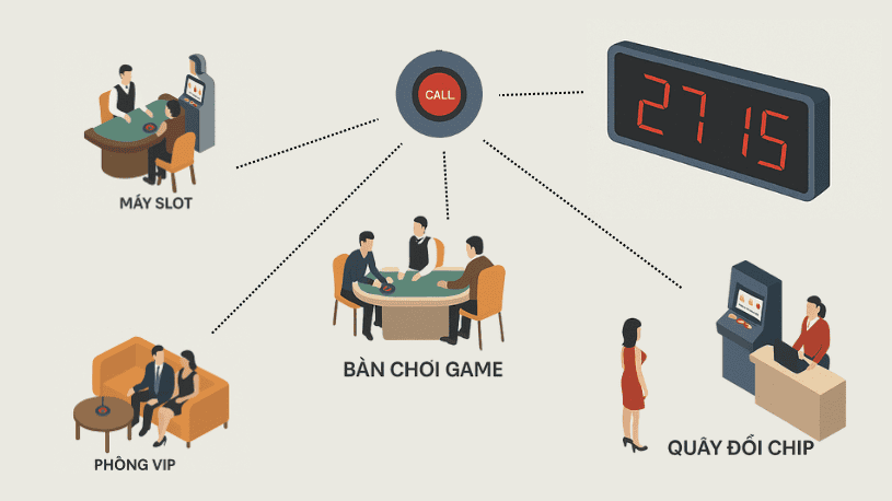 Quầy thu ngân – đổi chip: Nhân viên yêu cầu hỗ trợ từ quản lý hoặc bộ phận an ninh thông qua nút gọi khẩn.